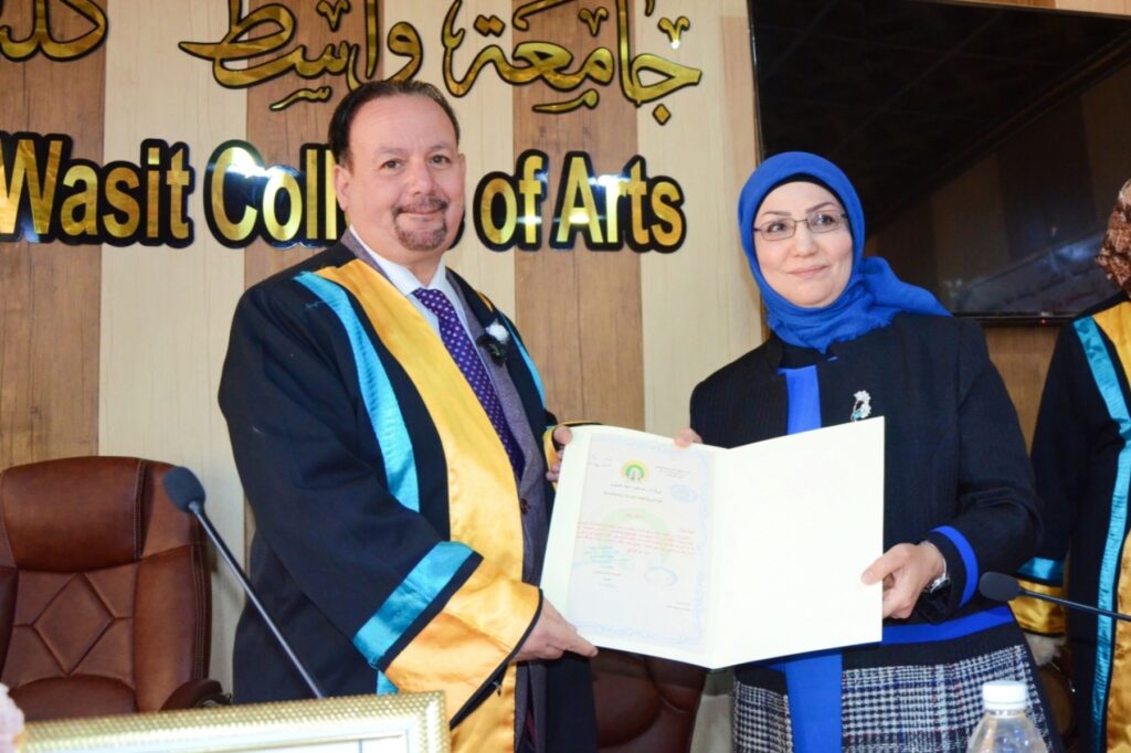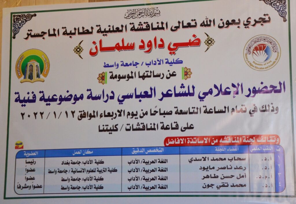 ناقشت كلية الآداب بجامعة واسط رسالة ماجستير بعنوان ( الحضور الإعلامي للشاعر العباسي دراسة موضوعية فنية )